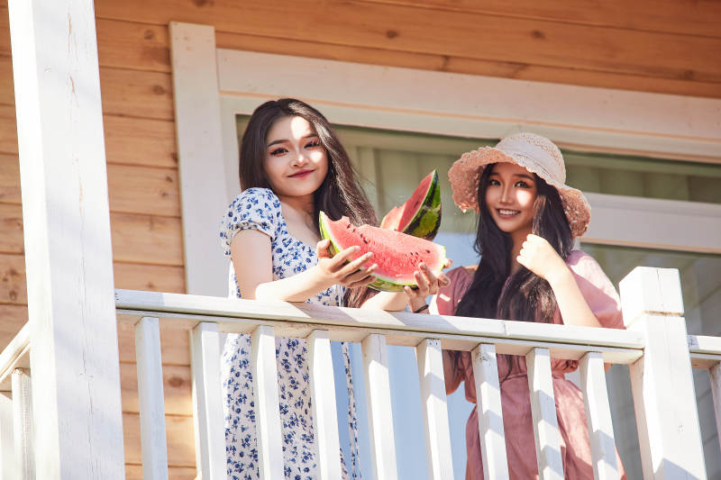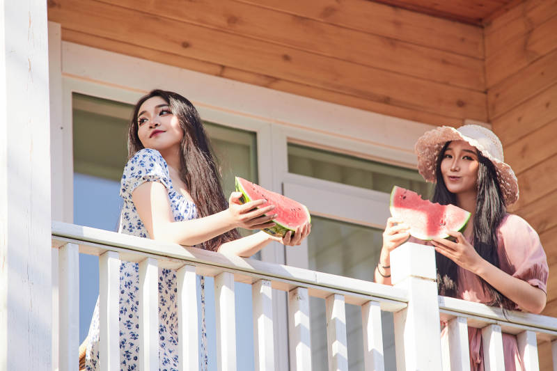 夏天在别墅门庭外拍照欣赏风景的亚洲美女