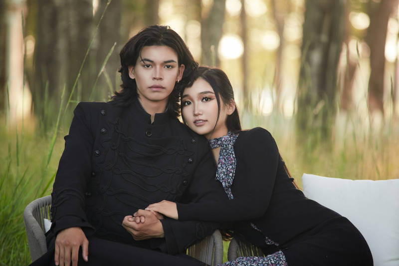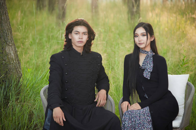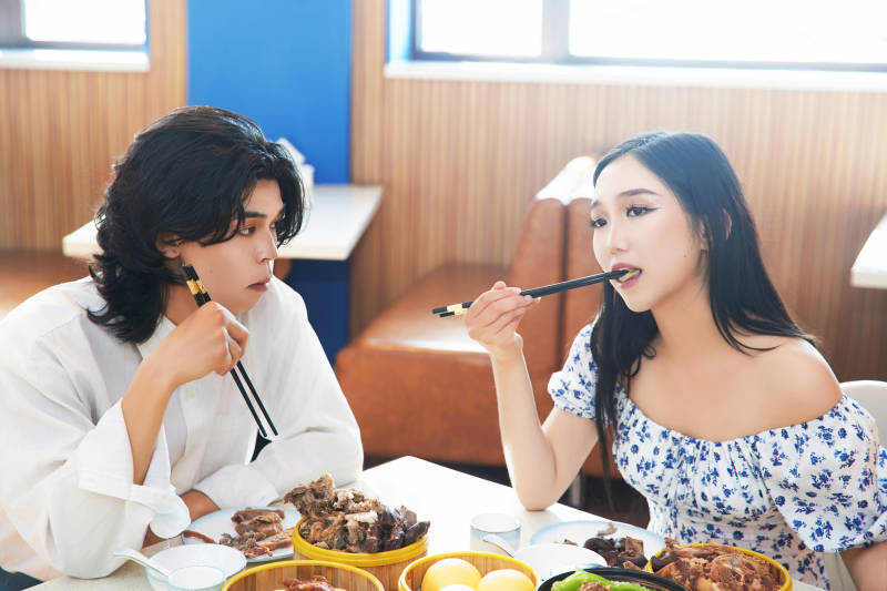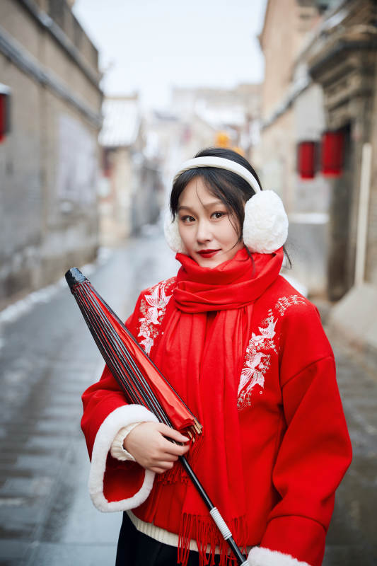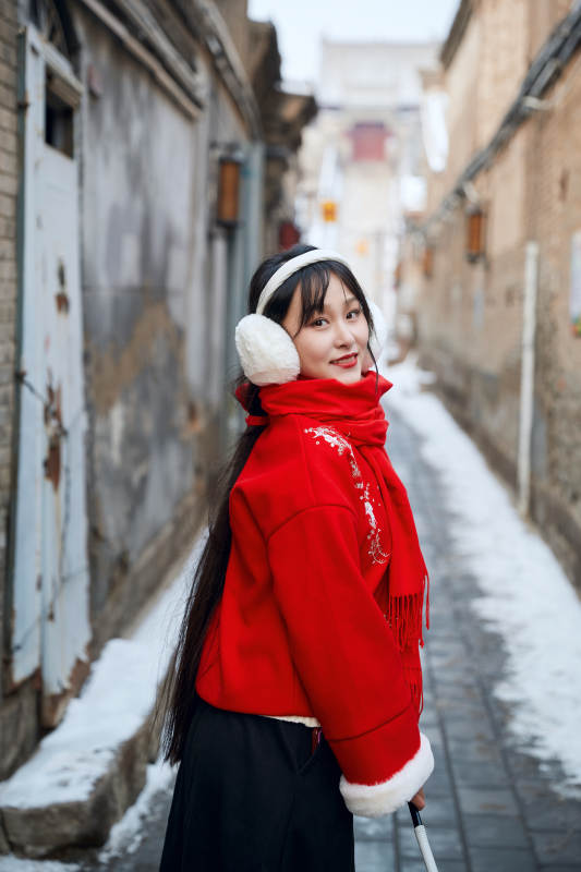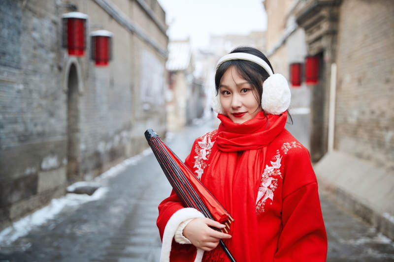 雪后在老城古巷穿着喜庆服饰的亚洲少女