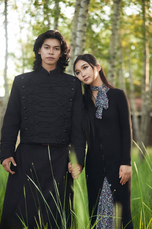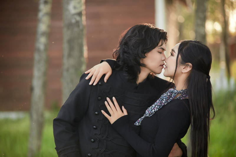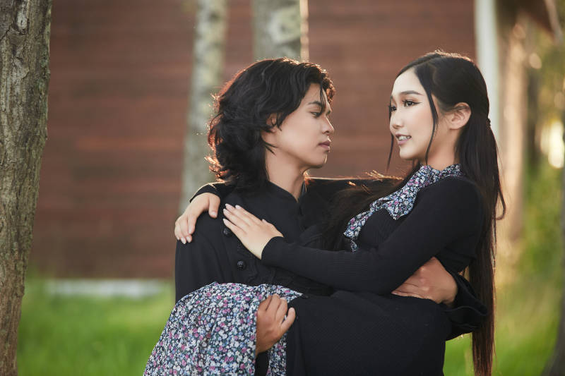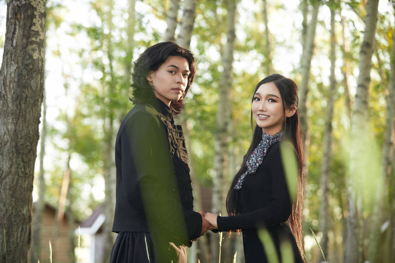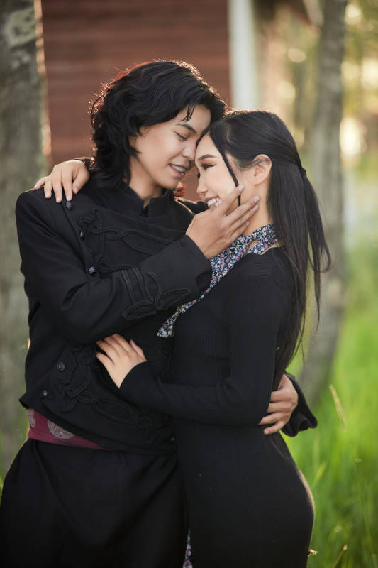 户外旅游景区拍照的亚洲情侣