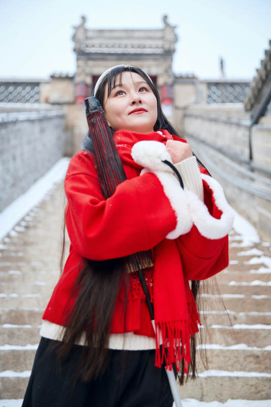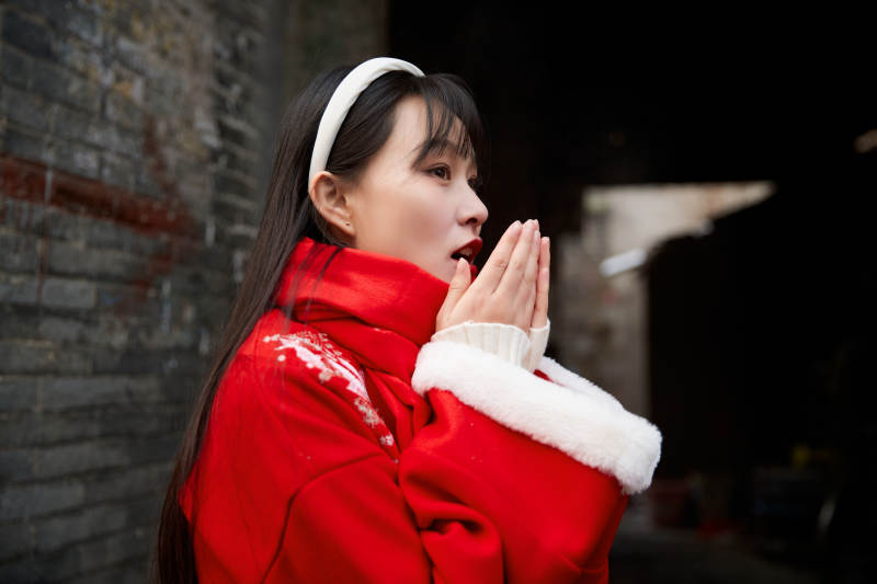 雪后在老城古巷穿着喜庆服饰的亚洲少女