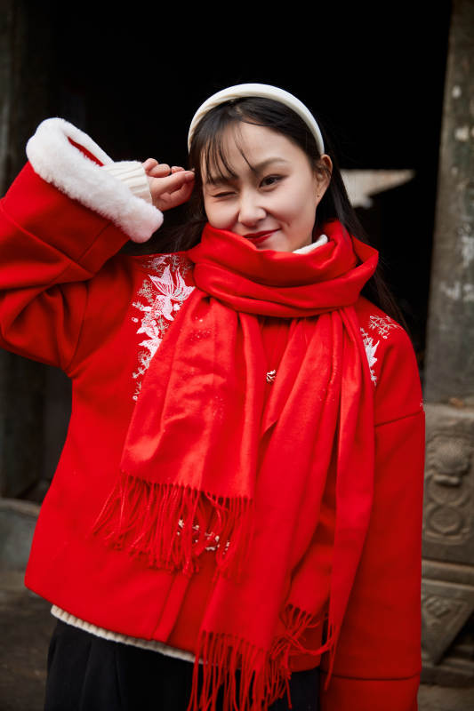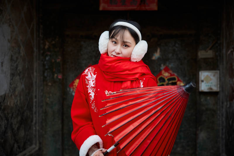 雪后在老城古巷穿着喜庆服饰的亚洲少女