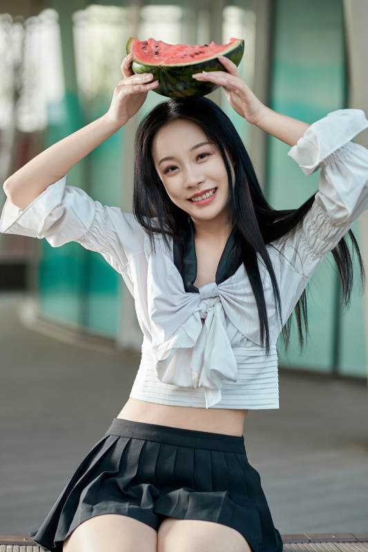 初夏户外公园吃西瓜的可爱少女