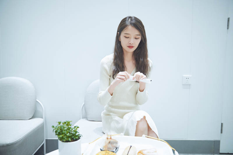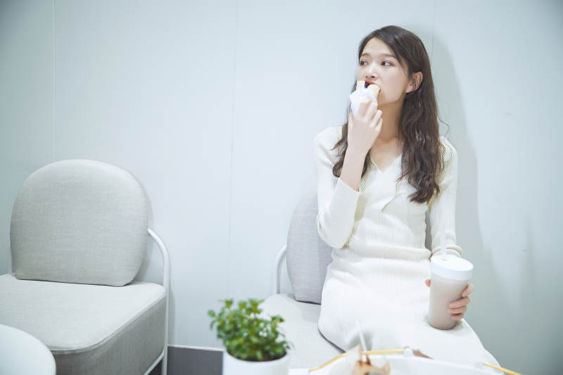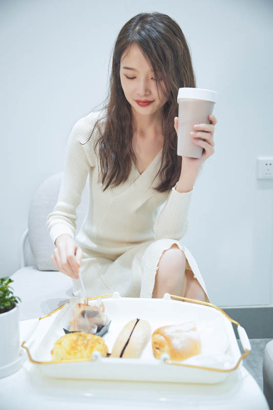 在烘焙店吃面包喝牛奶的可爱亚洲少女