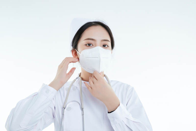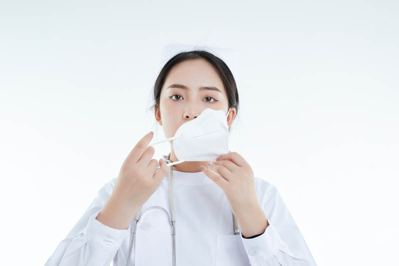 女性医护人员展示规范的口罩正确佩戴方式