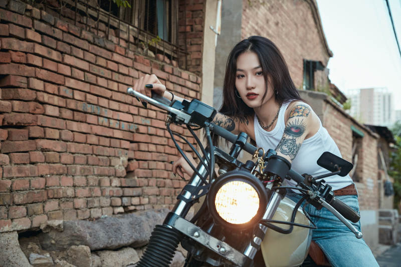 骑在复古摩托车上的时尚亚洲少女