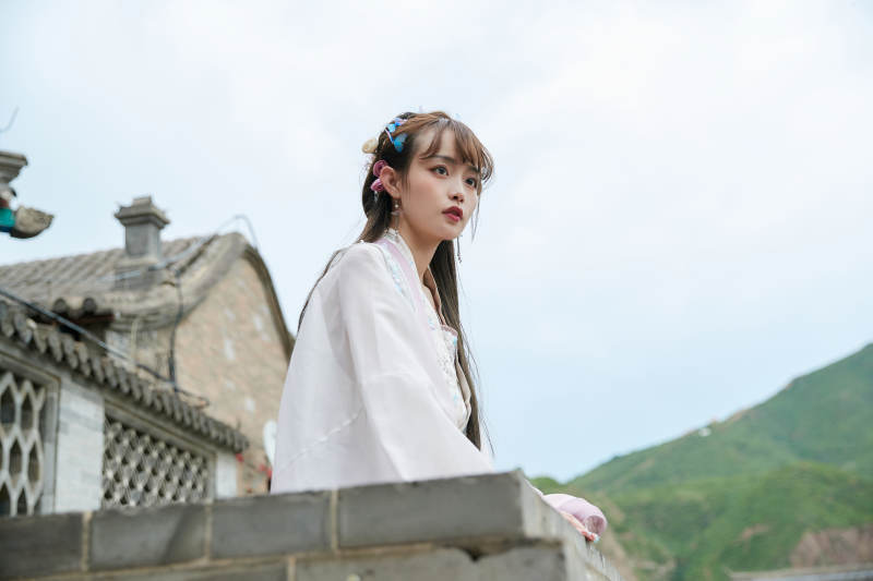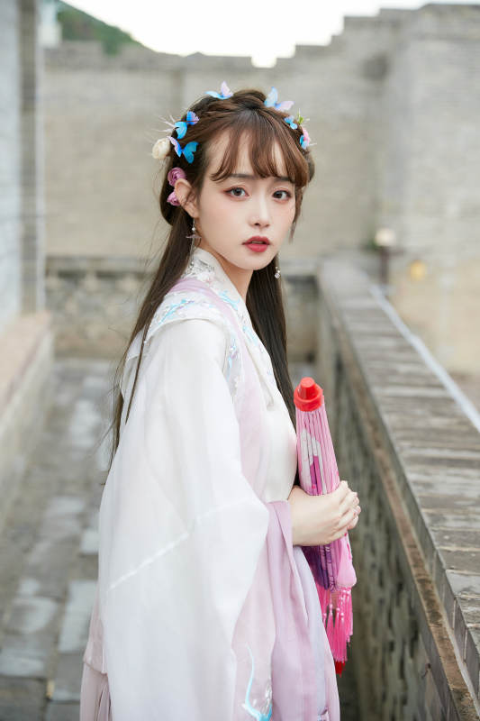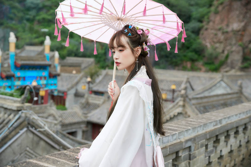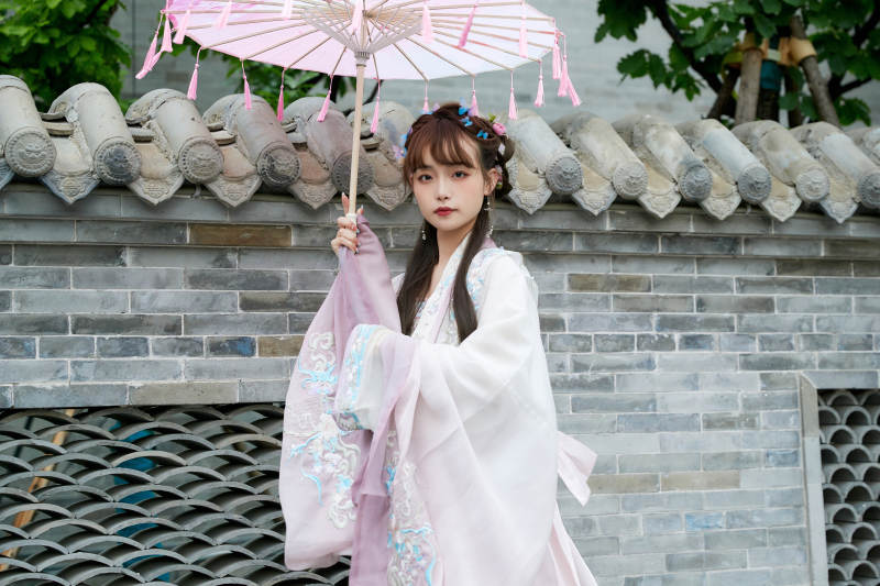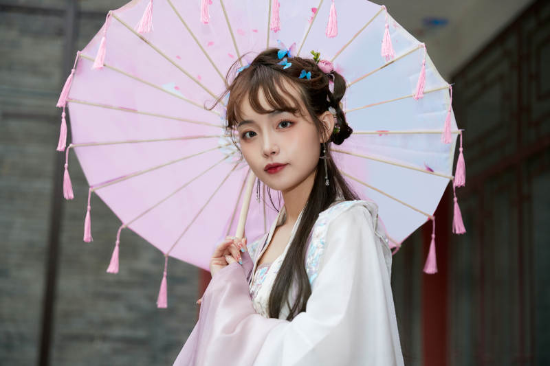 穿古装汉服手持工艺伞的东方美少女