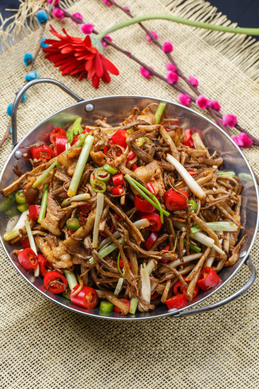黑铁锅装的鲜椒茶树菇
