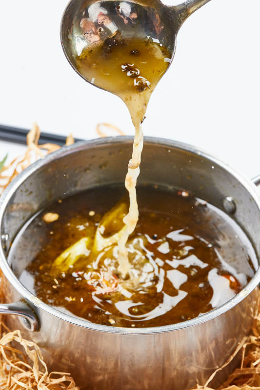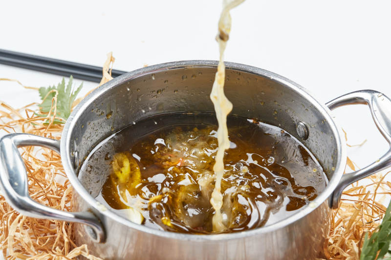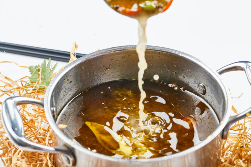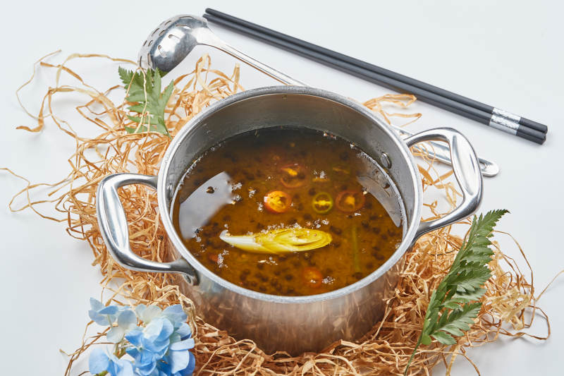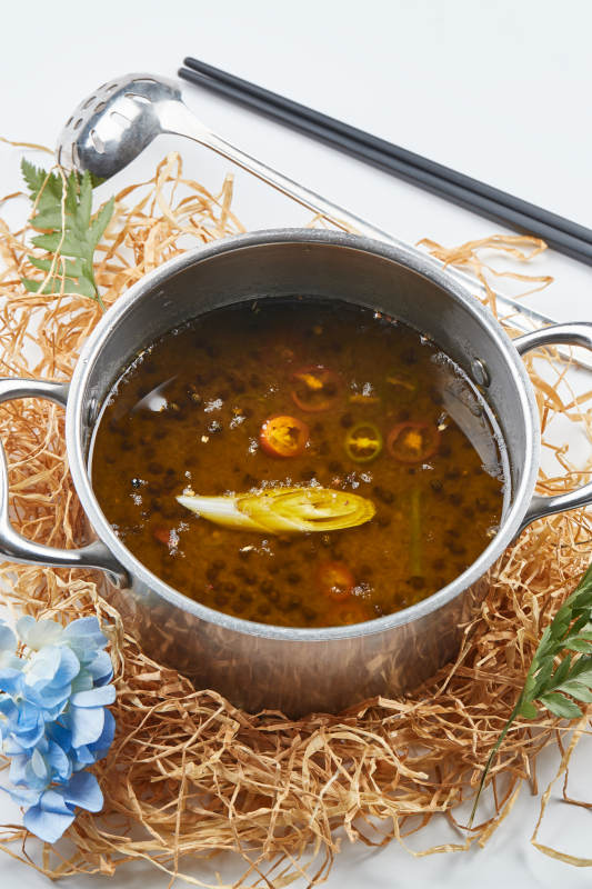 不锈钢锅装的藤椒椒麻汤底小火锅