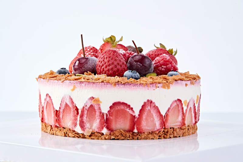 鲜水果点缀的鲜奶慕斯草莓烤坚果生日蛋糕