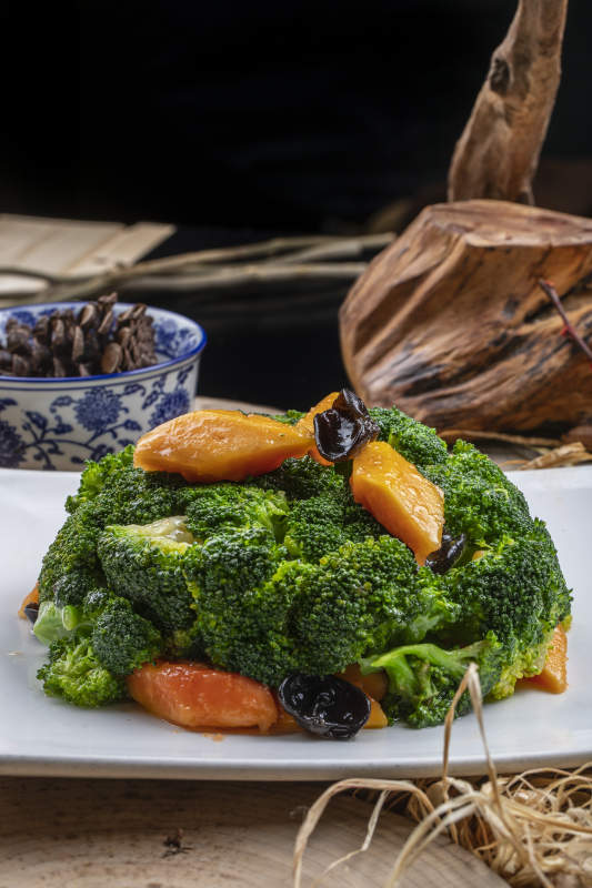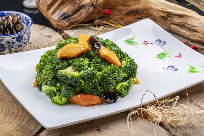 白色梅花瓷盘装的白灼西蓝花摆放在寿司帘上