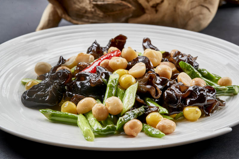 圆瓷盘装的乳瓜桃仁彩椒炒木耳