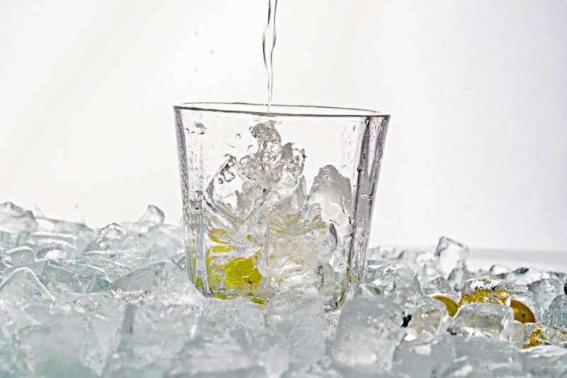 布满冰块的酒杯中的清凉白葡萄味预调酒