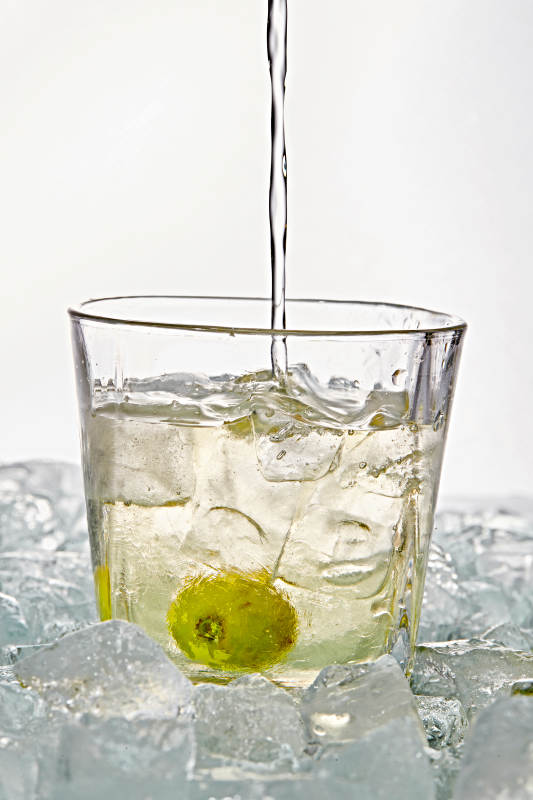 布满冰块的酒杯中的清凉白葡萄味预调酒