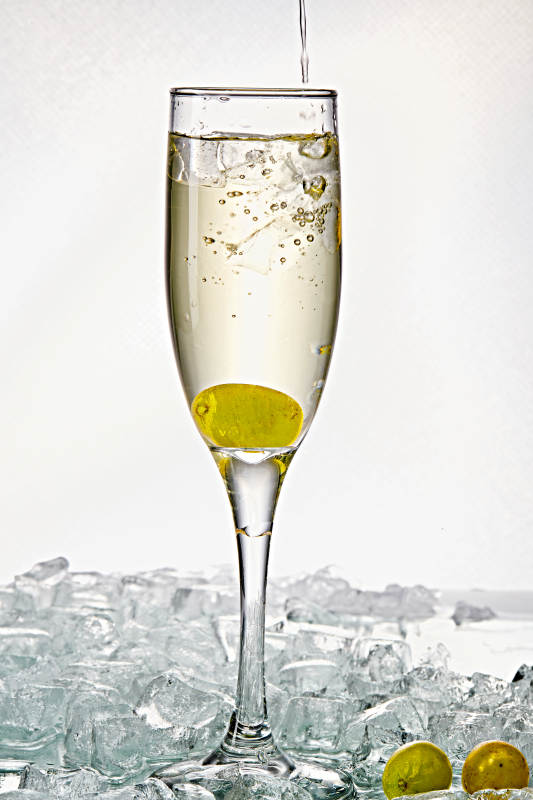 布满冰块的酒杯中的清凉白葡萄味预调酒