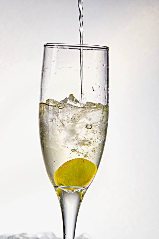 布满冰块的酒杯中的清凉白葡萄味预调酒
