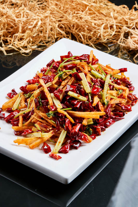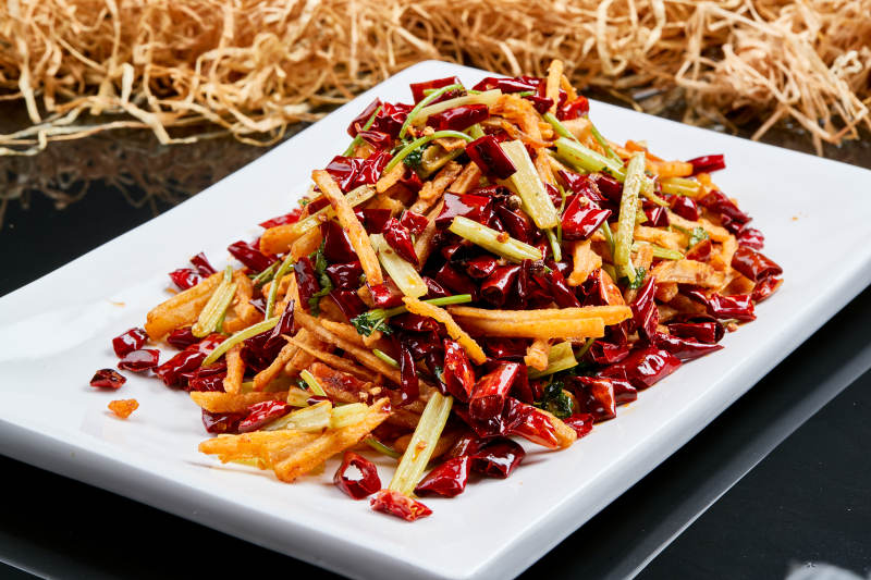 白色瓷盘装的的香辣西芹薯条鱿鱼身