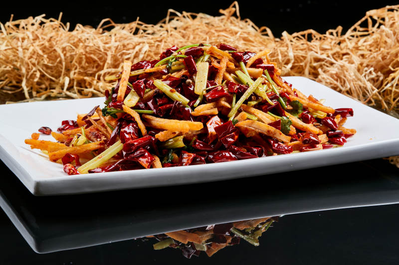 白色瓷盘装的的香辣西芹薯条鱿鱼身