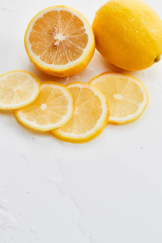 白色背景上摆放的新鲜水嫩柠檬及切片