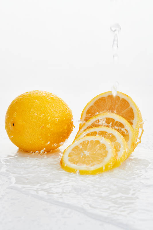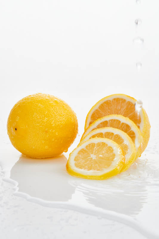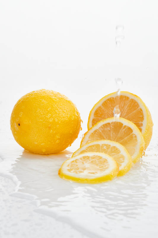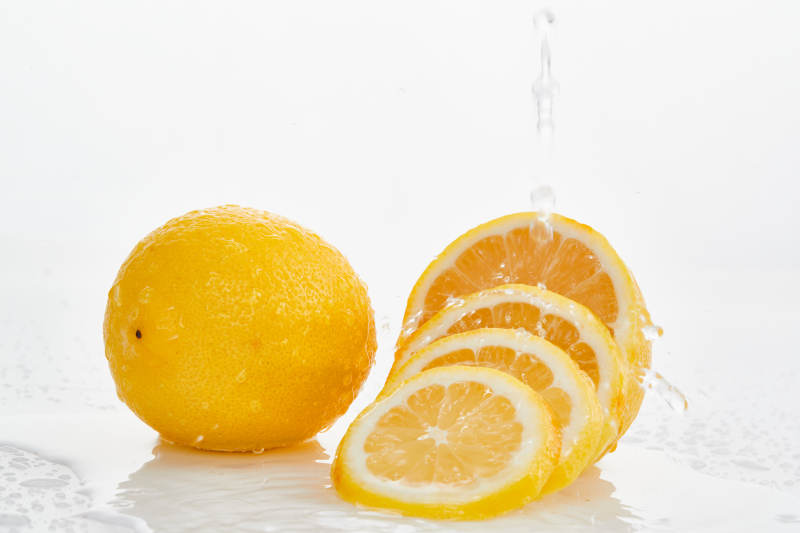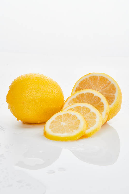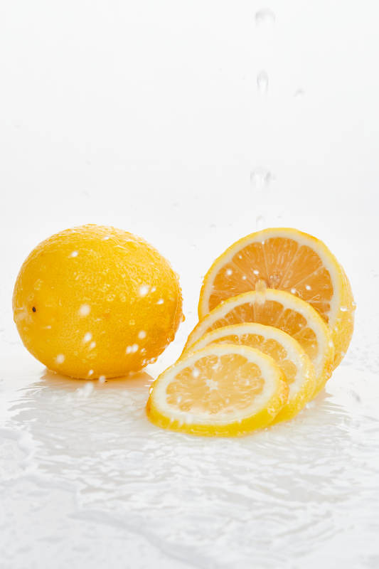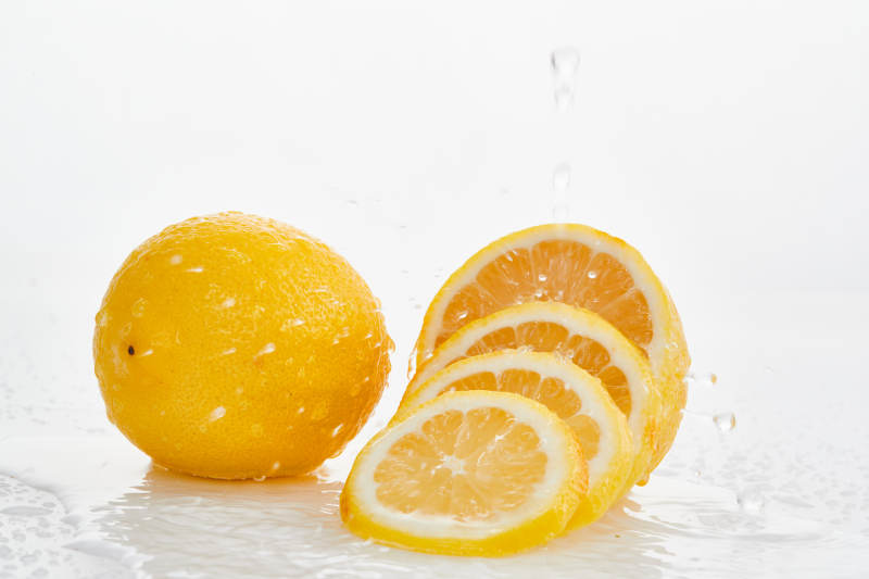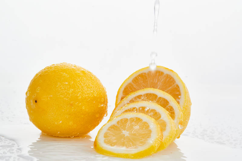 白色背景上摆放的新鲜水嫩柠檬及切片
