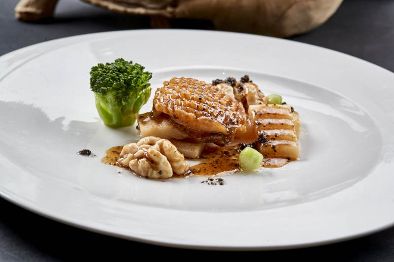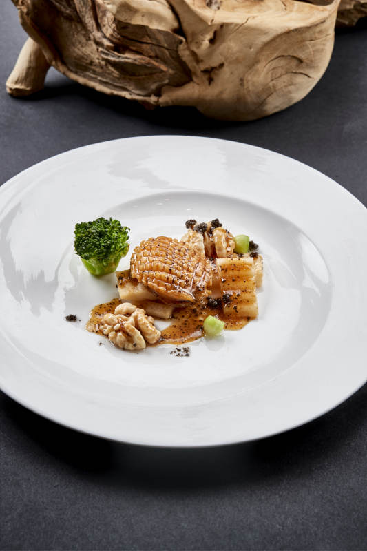 白色圆瓷盘装的黑胡椒桃仁大连鲍