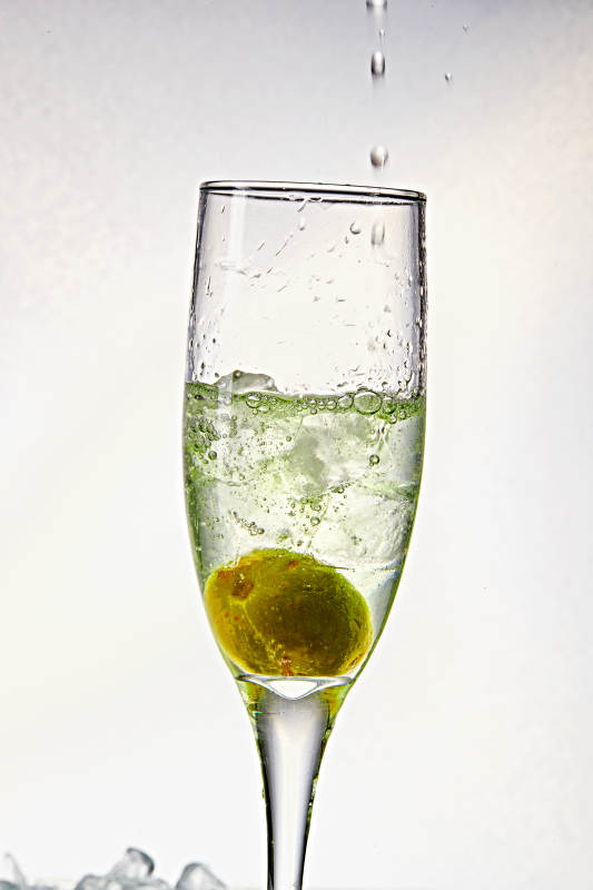布满冰块的酒杯中的清凉白葡萄味预调酒
