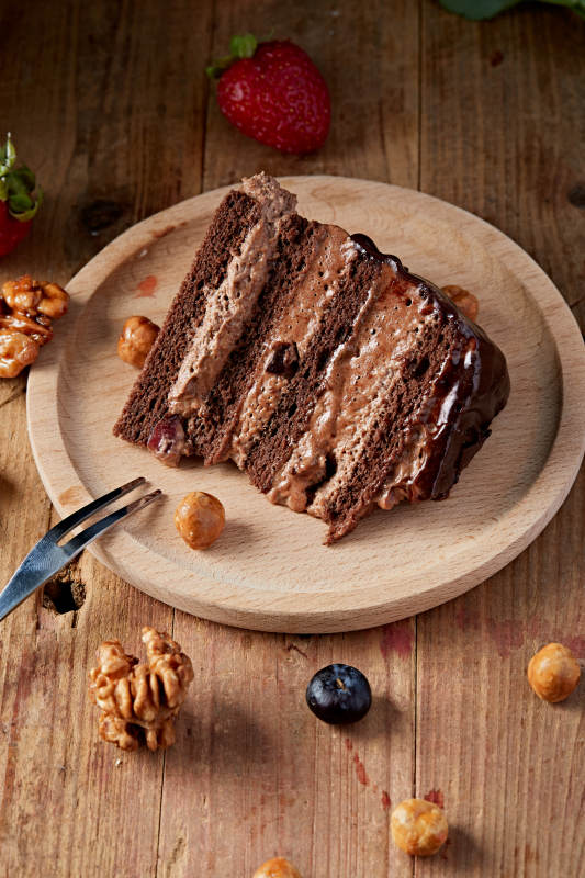 鲜水果点缀的鲜奶慕斯草莓烤坚果生日蛋糕