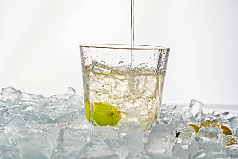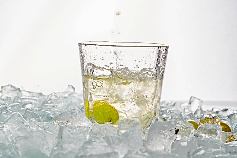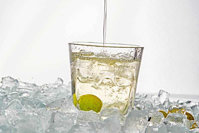 布满冰块的酒杯中的清凉白葡萄味预调酒