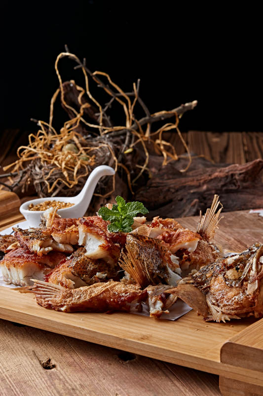 木质餐具上摆放的薯丝梅菜焗大明虾