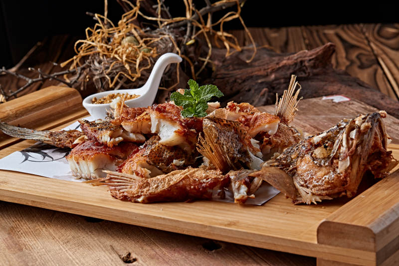 白色瓷盘装的川香油炸麻辣鸡翅中