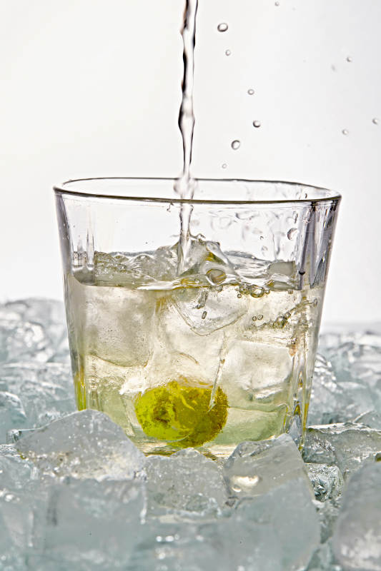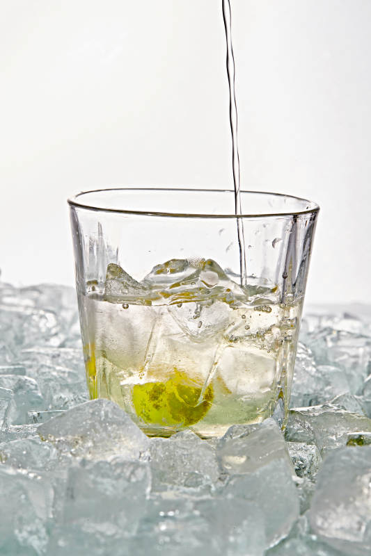 布满冰块的酒杯中的清凉白葡萄味预调酒