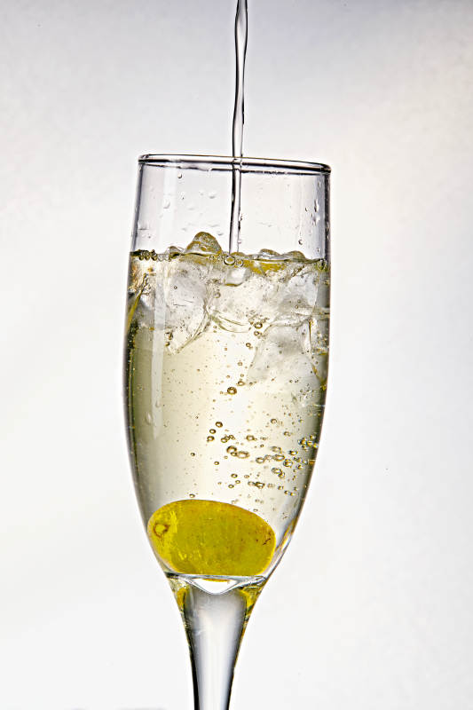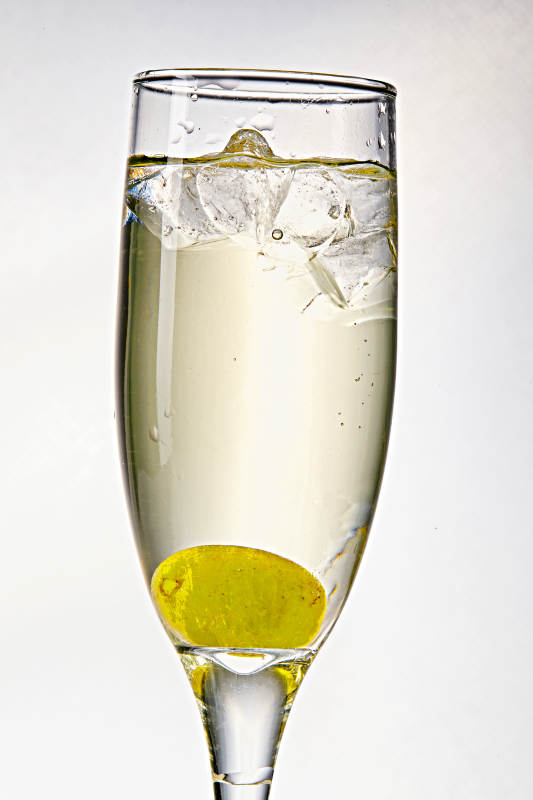 布满冰块的酒杯中的清凉白葡萄味预调酒