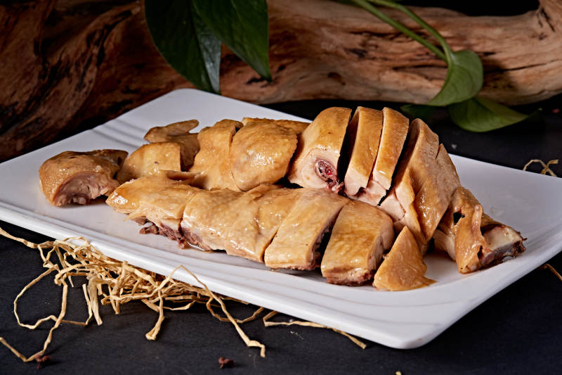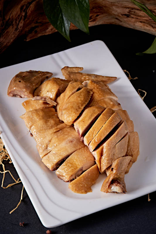 精美瓷盘装的压制熏肘花切片配香椿苗