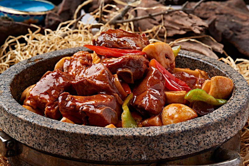 精美餐具装的熏肉粒蔬菜饼肉夹馍