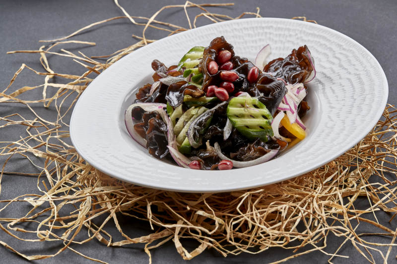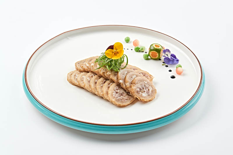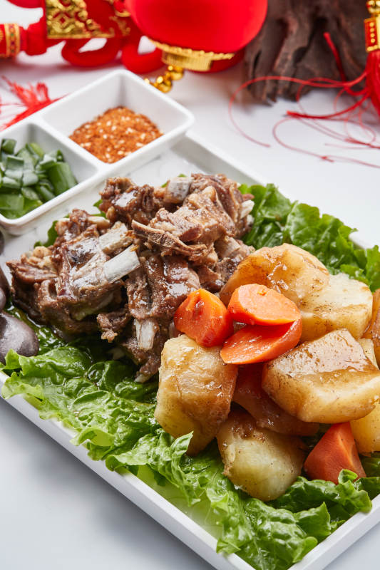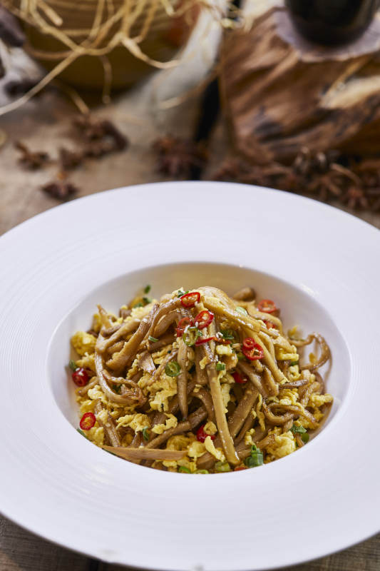 白色瓷盘装的黑椒杏鲍菇牛仔粒