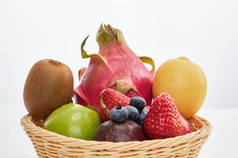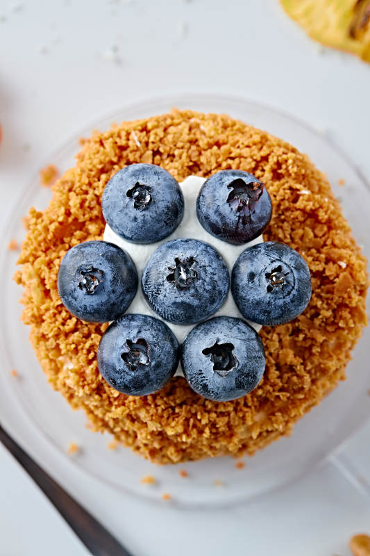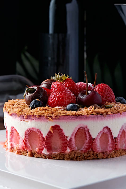 鲜水果点缀的鲜奶慕斯草莓烤坚果生日蛋糕