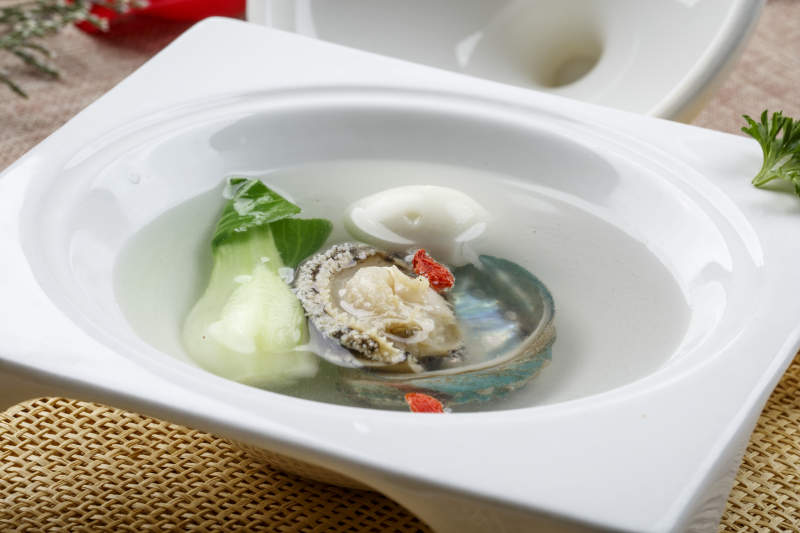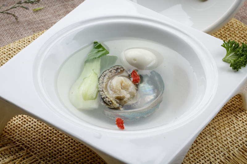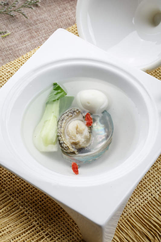白色圆形汤盆装的海鲜水萝卜炖天鹅蛋
