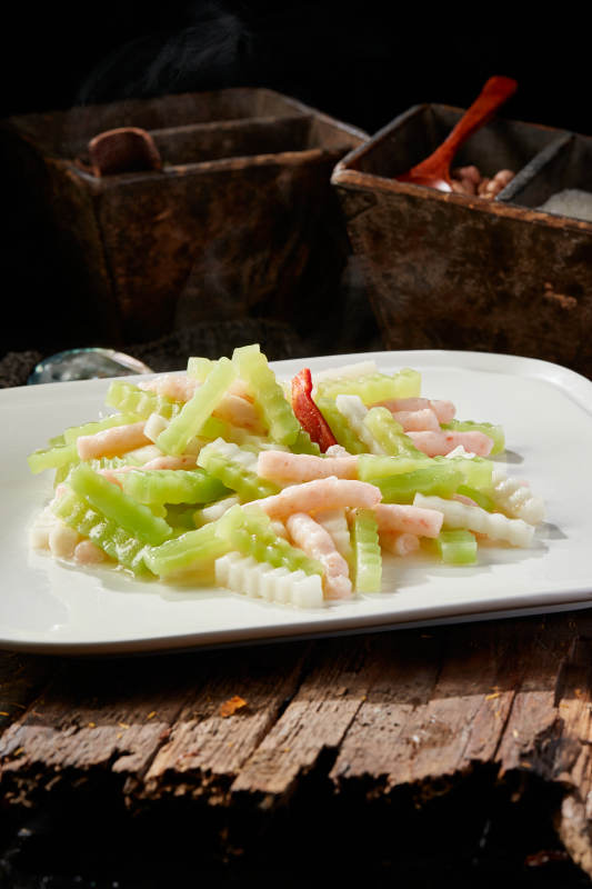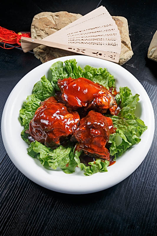 白色瓷盘装的浇汁酱香枸杞油麦菜