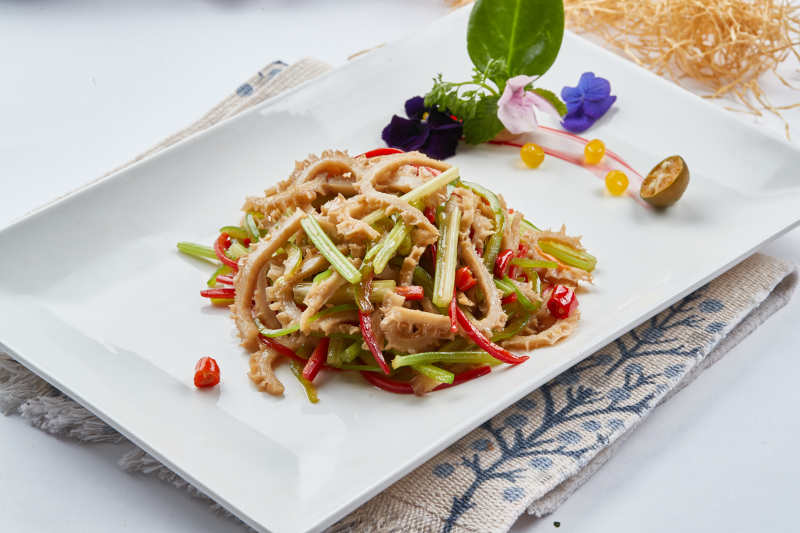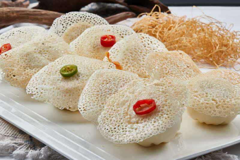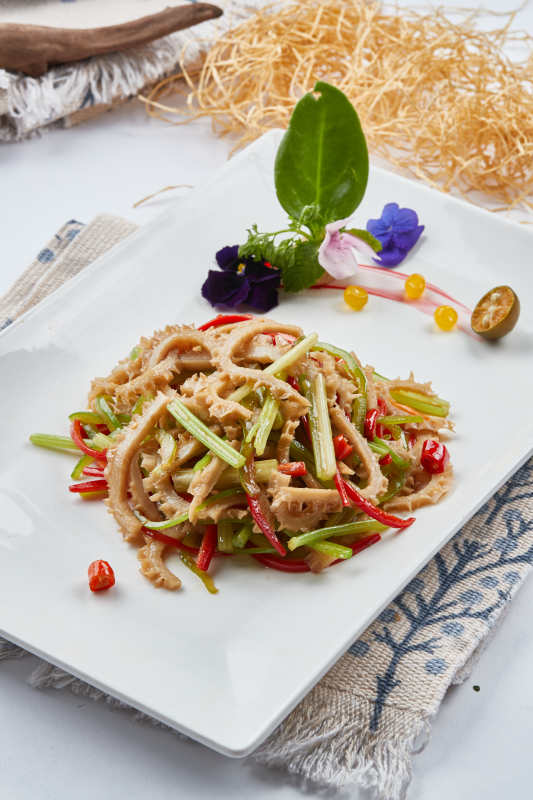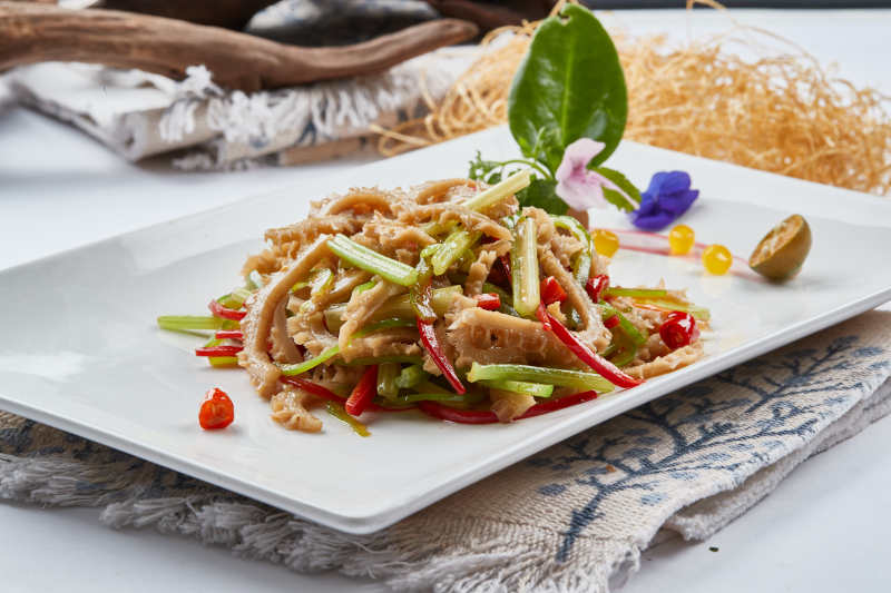 白色瓷盘组昂的豆腐皮熏肉卷切片