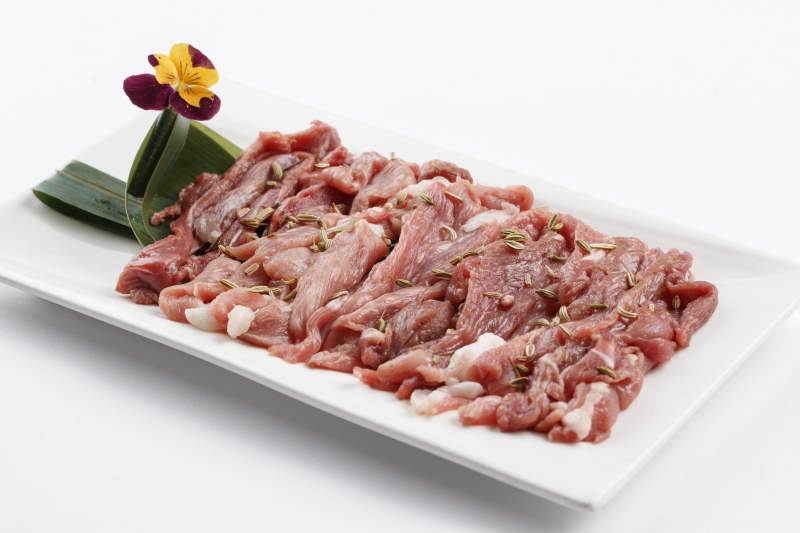 长方形白瓷盘装的黑胡椒腌制牛排肉