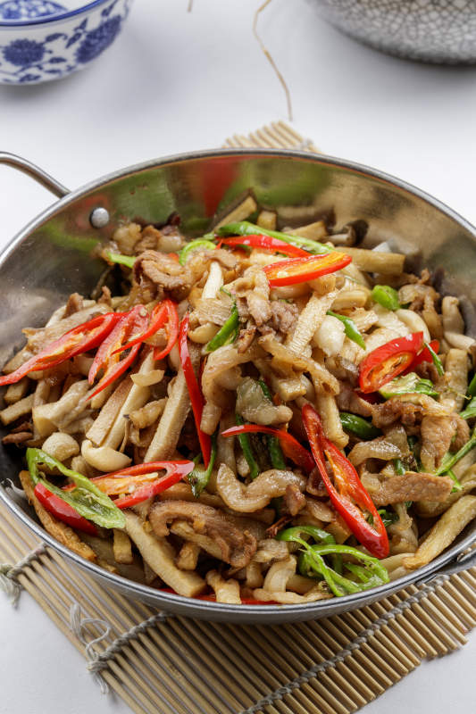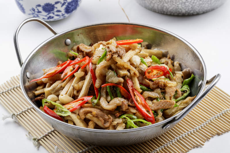 铁锅装的干锅山珍菌摆放在寿司帘上