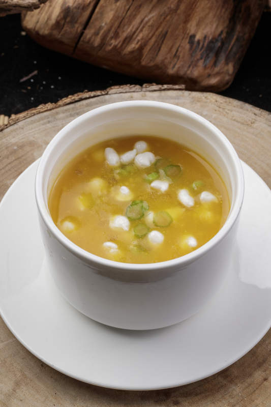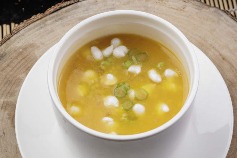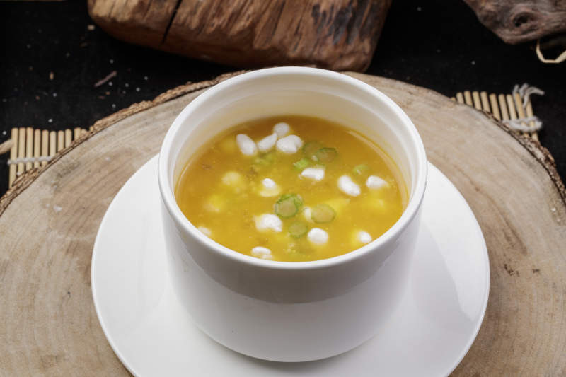 白鹅瓷盘装的枸杞蟹黄浓汤