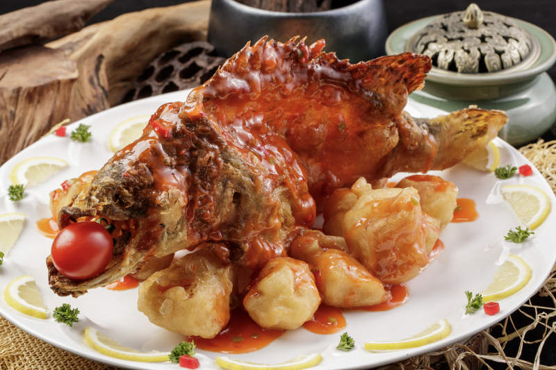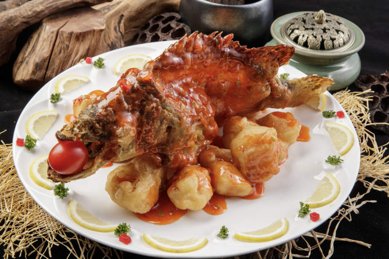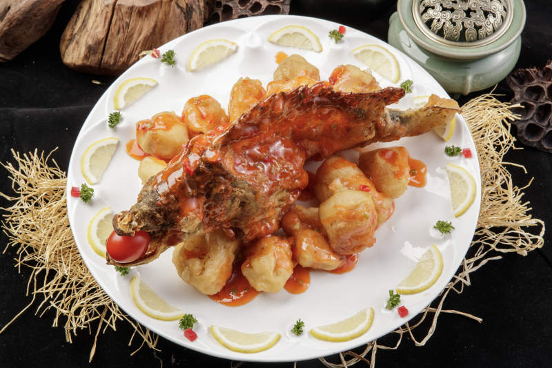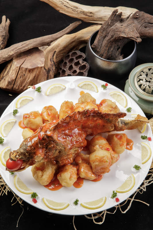 白色盘装的浇汁油炸桂鱼大虾球