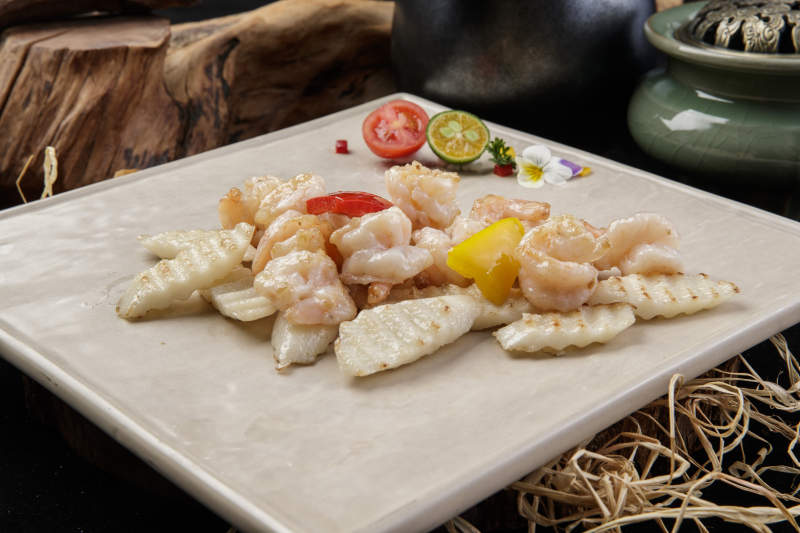 方形瓷盘装的开背大虾摆放在樟木砧板上