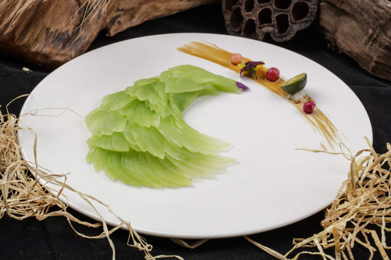 白色圆瓷盘装的凤尾青笋摆放在黑色背景上