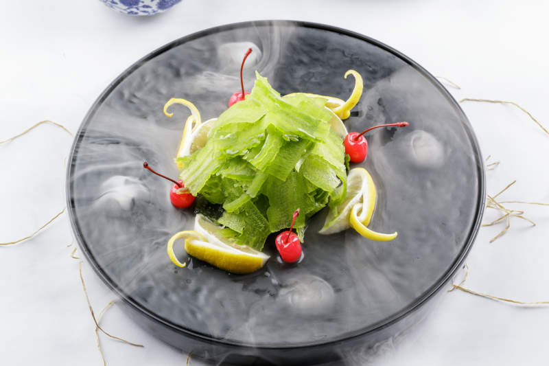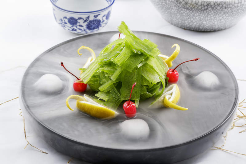 冰镇养生凉瓜摆放在干冰缭绕的黑色食盘上