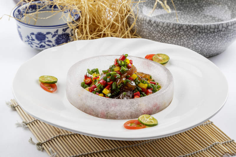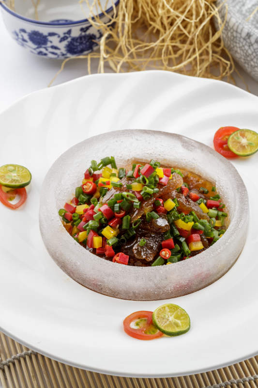 白色瓷盘装的老醋蛰头摆放在寿司帘上