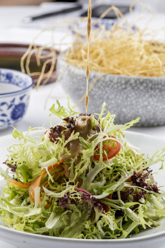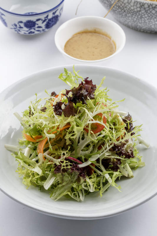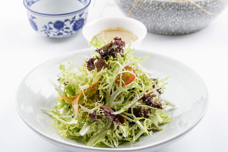 青色瓷盘装的呛拌苦菊摆放在白色背景上