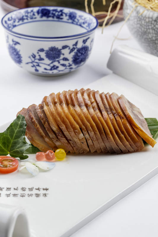 长瓷盘装的烟熏肘花摆放在白色背景上