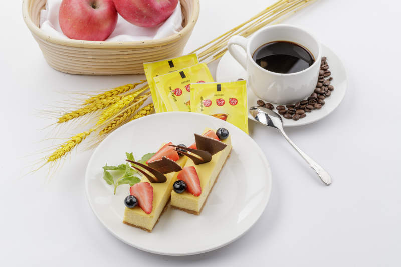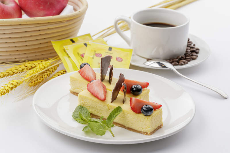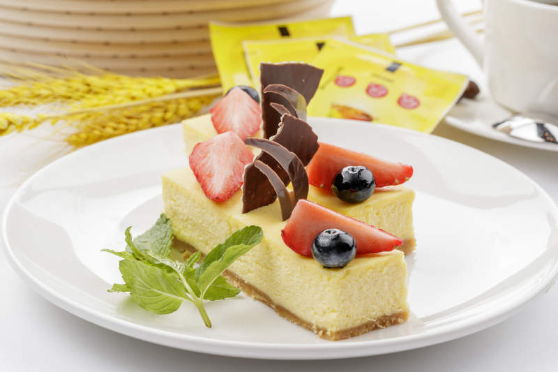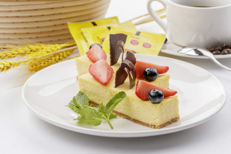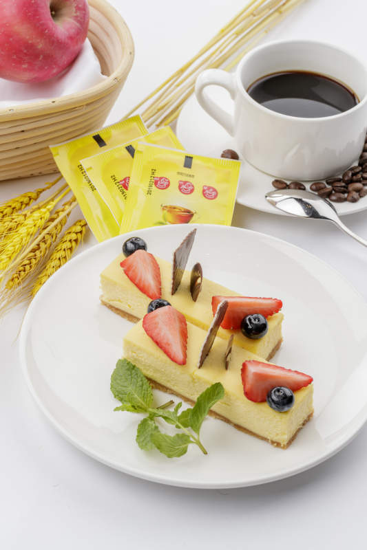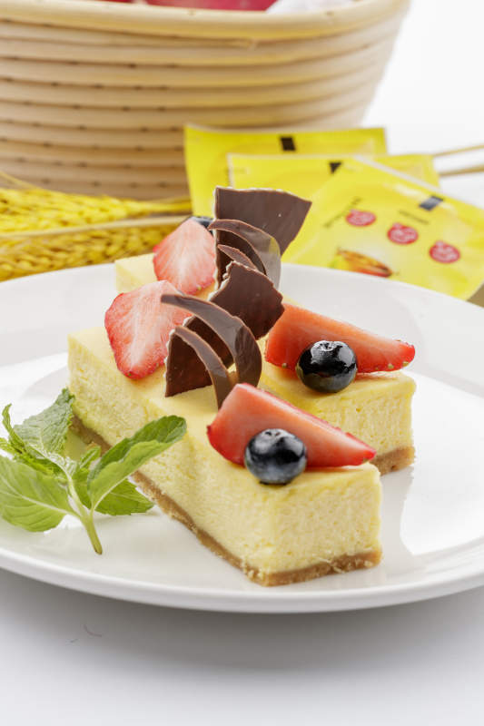巧克力酱抹茶奶酪慕斯蛋糕摆放在白色背景上