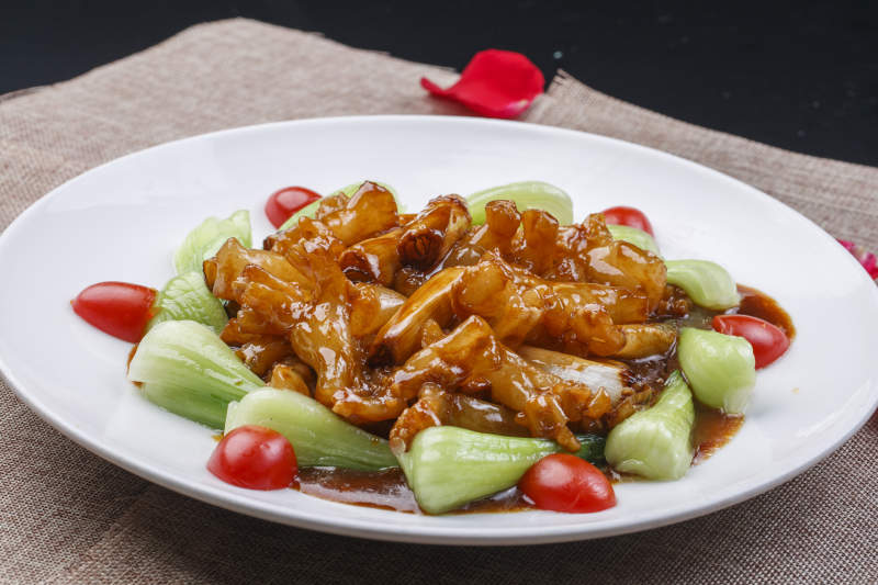 白色圆瓷盘装的葱烧海参蹄筋